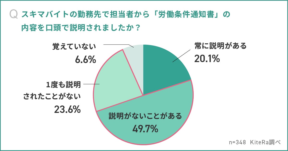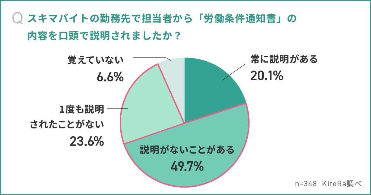 「スキマバイトの勤務先で、担当者から労働条件通知書の内容を口頭で説明されましたか」と質問したところ、「1度も説明されたことがない」と回答した人が23.6%、「説明されないことがある」と回答した人が49.7%との結果に。