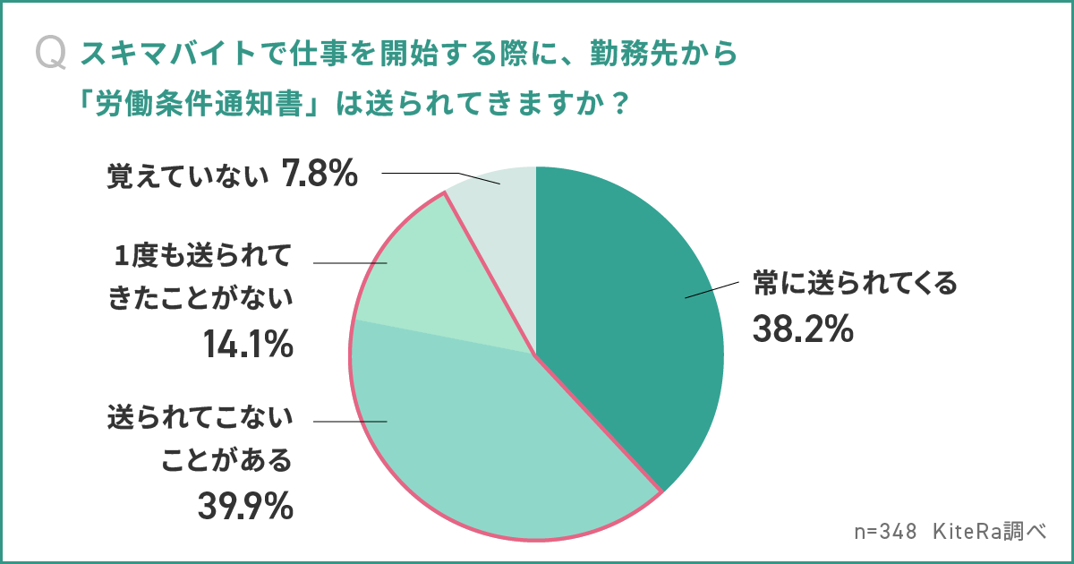 「スキマバイトで仕事を開始する際に勤務先から労働条件通知書は送られてきますか」と質問したところ、「1度も送られてきたことがない」と回答した人が14.1%、「送られてこないことがある」と回答した人が39.9%で、5割以上が勤務先から労働条件通知書が送られてこなかった経験があることが判明した。