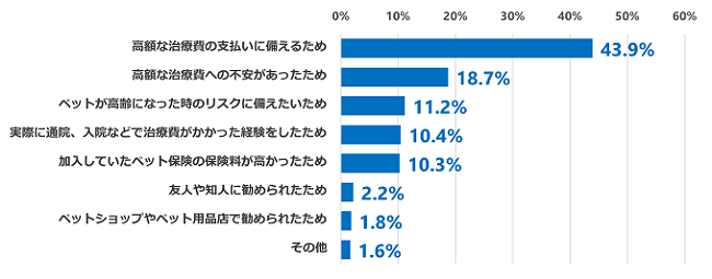 ペット保険に加入したきっかけ(複数回答可)は、「高額な治療費の支払いに備えるため」が43.9%と最も多く、続いて「高額な治療費への不安があったため」が18.7%となりました。