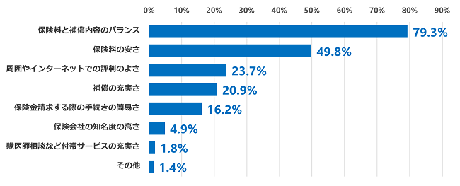 ペット保険選びで重視した点(複数回答可)は「保険料と補償内容のバランス」が79.3%と最も多く、次いで「保険料の安さ」が49.8%、「周囲やインターネットでの評判のよさ」が23.7%と続きました。