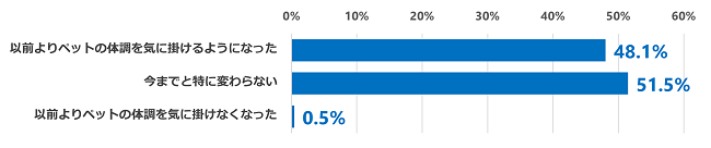 新型コロナウイルスの感染拡大以降、ペットと触れ合う時間が増えたかについては、78.6%の方が「はい」と答えました。また、触れ合う時間が増えたことによって「以前よりペットの体調に気を掛けるようになった」と回答した方が48.1%という結果となりました。