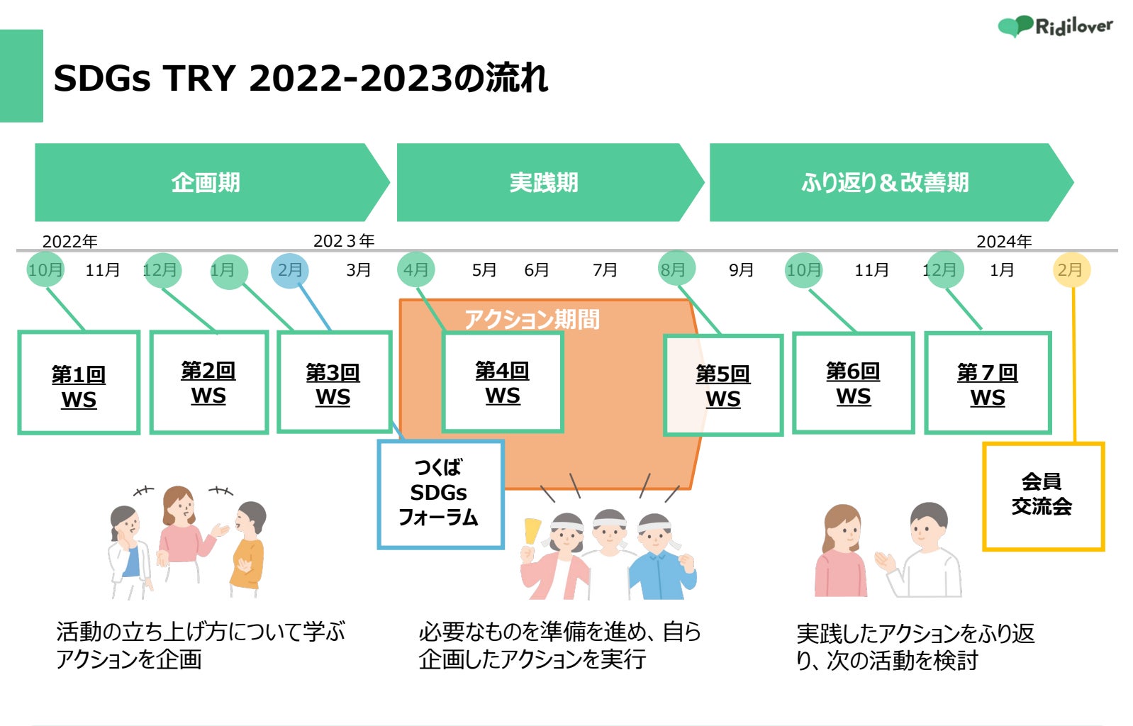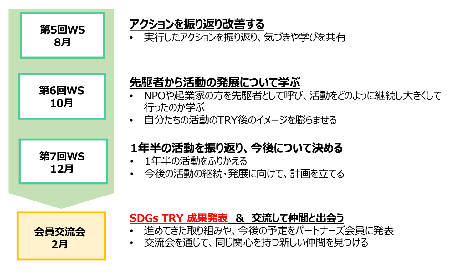 - 市民が自らの手で課題解決の活動を生むプログラム、期間を2倍にし、アクションの企画、実行、振り返りのPDCAを回すことで持続的な活動を目指す