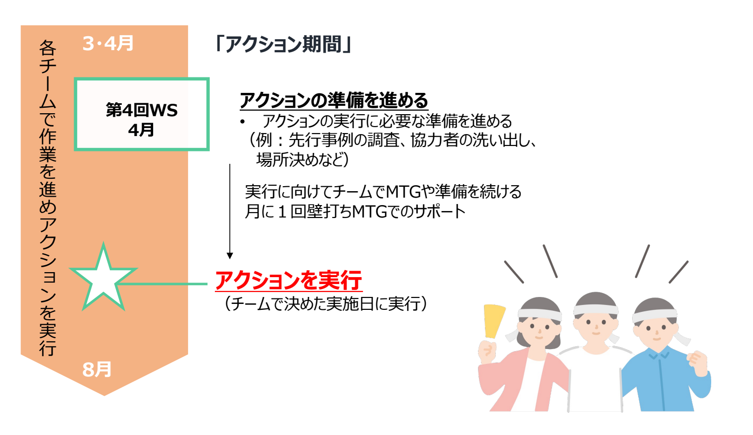 3月〜8月は「アクション期間」とし、企画したアクションの準備を各チームが進め、期間内に実行していきます。