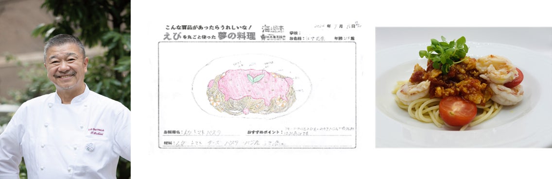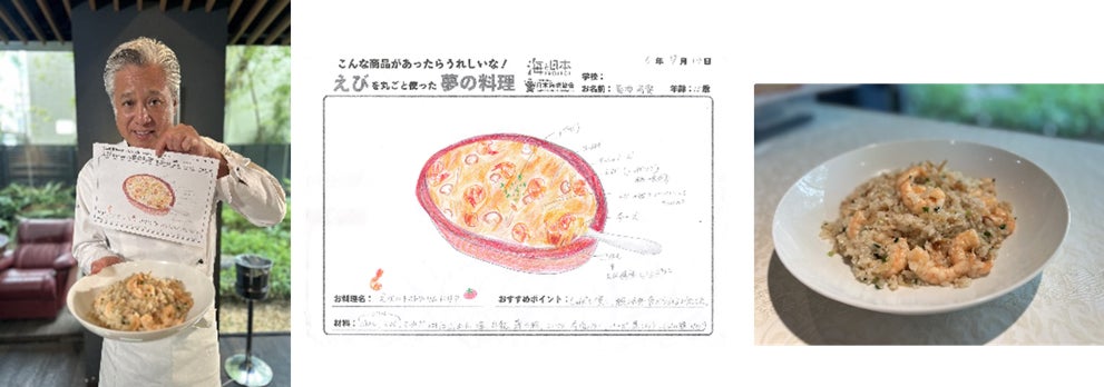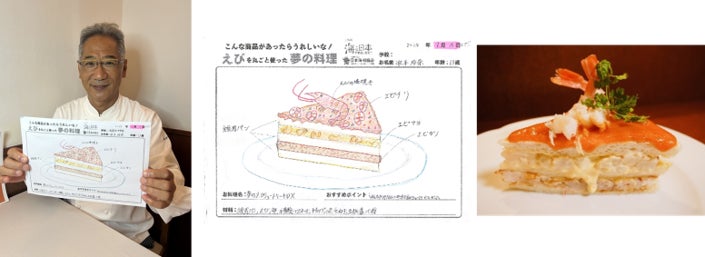 「えび丸ごと夢の料理コンテスト」は、ただ夢のエビ料理を描くだけではありません。「シェフ部門」を受賞した作品は、テレビでも紹介される一流レストランのシェフが実際に作ってくれるのです。今回も、日本におけるイタリア料理の先駆者ともいえる落合務シェフや、長年フランス料理界を牽引してきた三國清三シェフ、メディアでも度々紹介される創作中華の名店「トゥーランドット 臥龍居」の脇屋友詞シェフなど、さまざまなジャンルの第一線で活躍するシェフたちが、子どもたちの夢の料理を完全再現してくれました