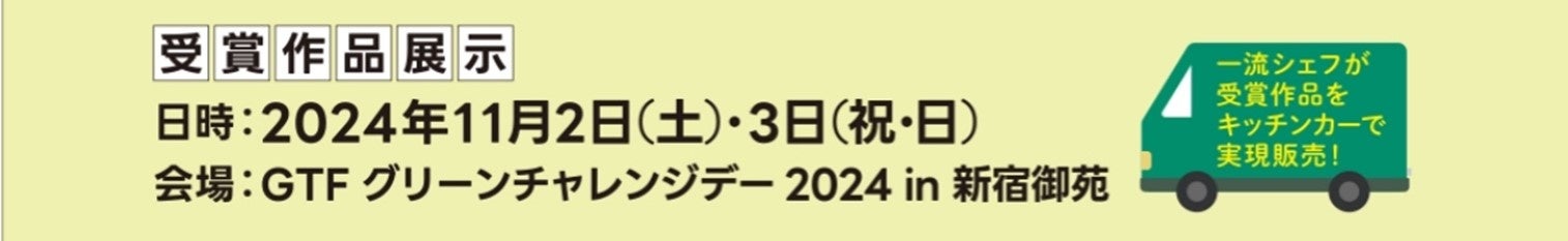 なお、受賞作品は、11月2日(土)・3日(祝・日)に新宿御苑で行われるイベント「GTFグリーンチャレンジ―デー2024」にて展示されます。受賞作品のうち「えびのトマトクリームドリア」と「えびてんうどん」×「えびの流しそうめん」のコラボメニューは、当日キッチンカーで実演販売されますので、ぜひ一流シェフの味をお楽しみください。