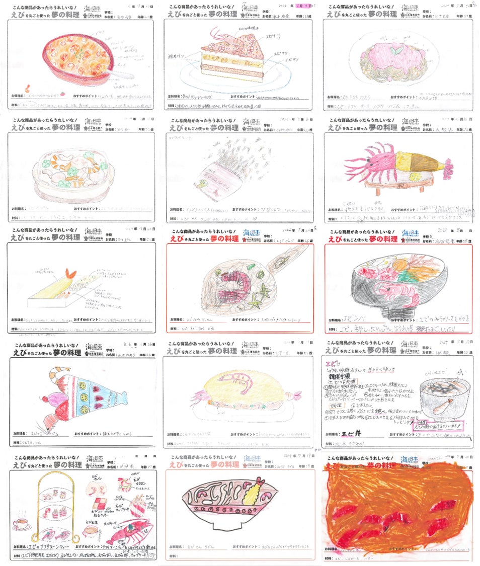 全国の教育機関(小・中・高等学校、保育園、幼稚園など)の子どもたちに「自分が食べたい夢のエビ料理」を自由な発想で描いてもらうコンテストで、今年で4回目を迎えます。参加校には有頭エビを無償提供し、エビの特徴を実際に観察しながら解剖を体験。エビに触れ、その生態を知ることで「エビは生き物である」ことを改めて体感してもらう企画です。