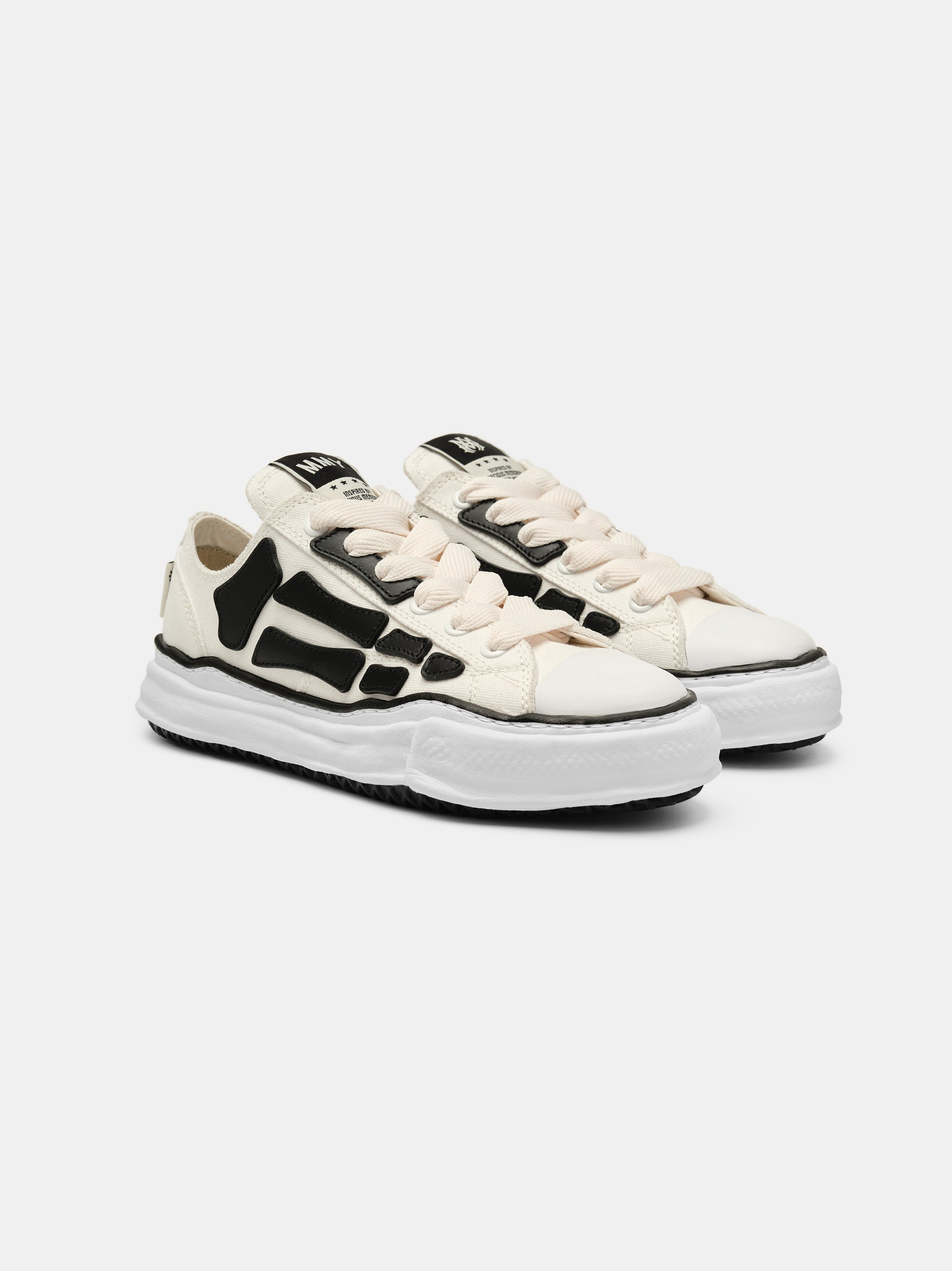 AMIRI X Maison MIHARA YASUHIROは、メゾン ミハラヤスヒロの粘土を使って手作業で型取った「オリジナルソール」を使用し、アミリのシグネチャーであるナッパレザーの 「BONES 」ワッペンをキャンバスのボディに組み合わせたスニーカーです。シュータンとヒールには互いのブランドロゴを刺しゅうした特徴的な手触りのウーブンラベルをあしらっています。