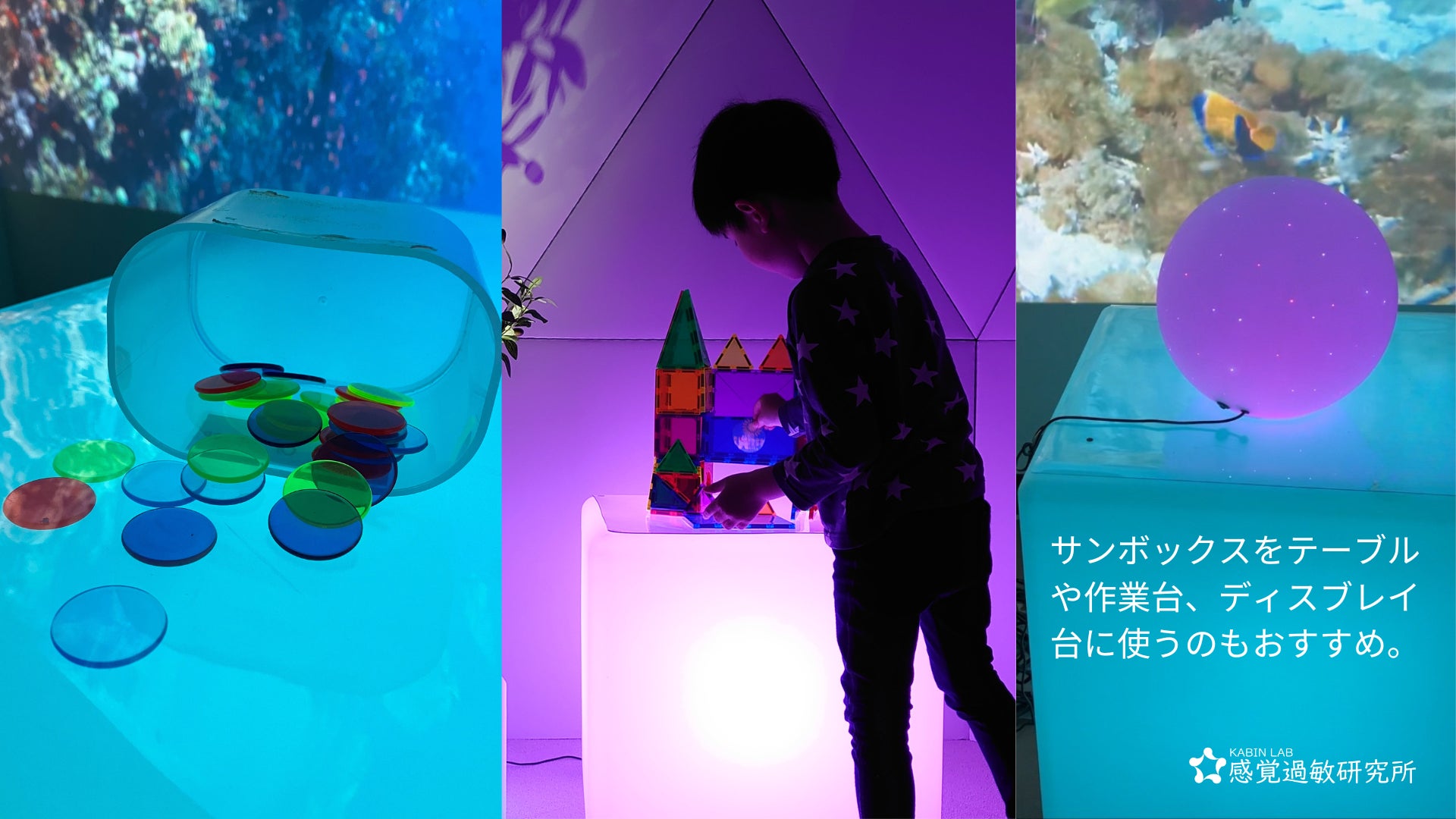 また、スヌーズレンルーム(マルチセンサリールーム)のプロデュースや、おすすめアイテムの相談、カームダウンボックスと組み合わせた空間・環境調整のアドバイスも行っています。