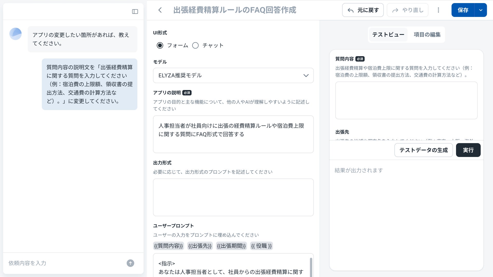 また、要件に沿ってELYZA Worksが作成したアプリについて、本機能を通じて追加の要求や改善点を伝えることで、フォーム項目やプロンプトの修正・微調整もAIが自動で行います。