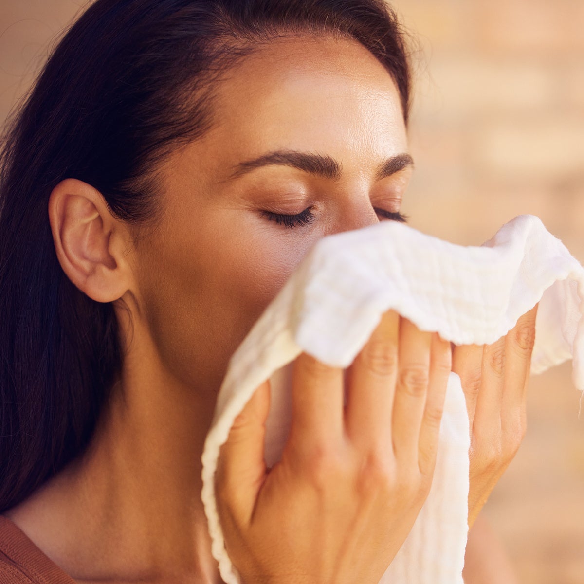 <2> クロスなどをお湯に浸し、軽く絞ってから顔全体を覆い、肌にしみこませるようにやさしくプレスします。