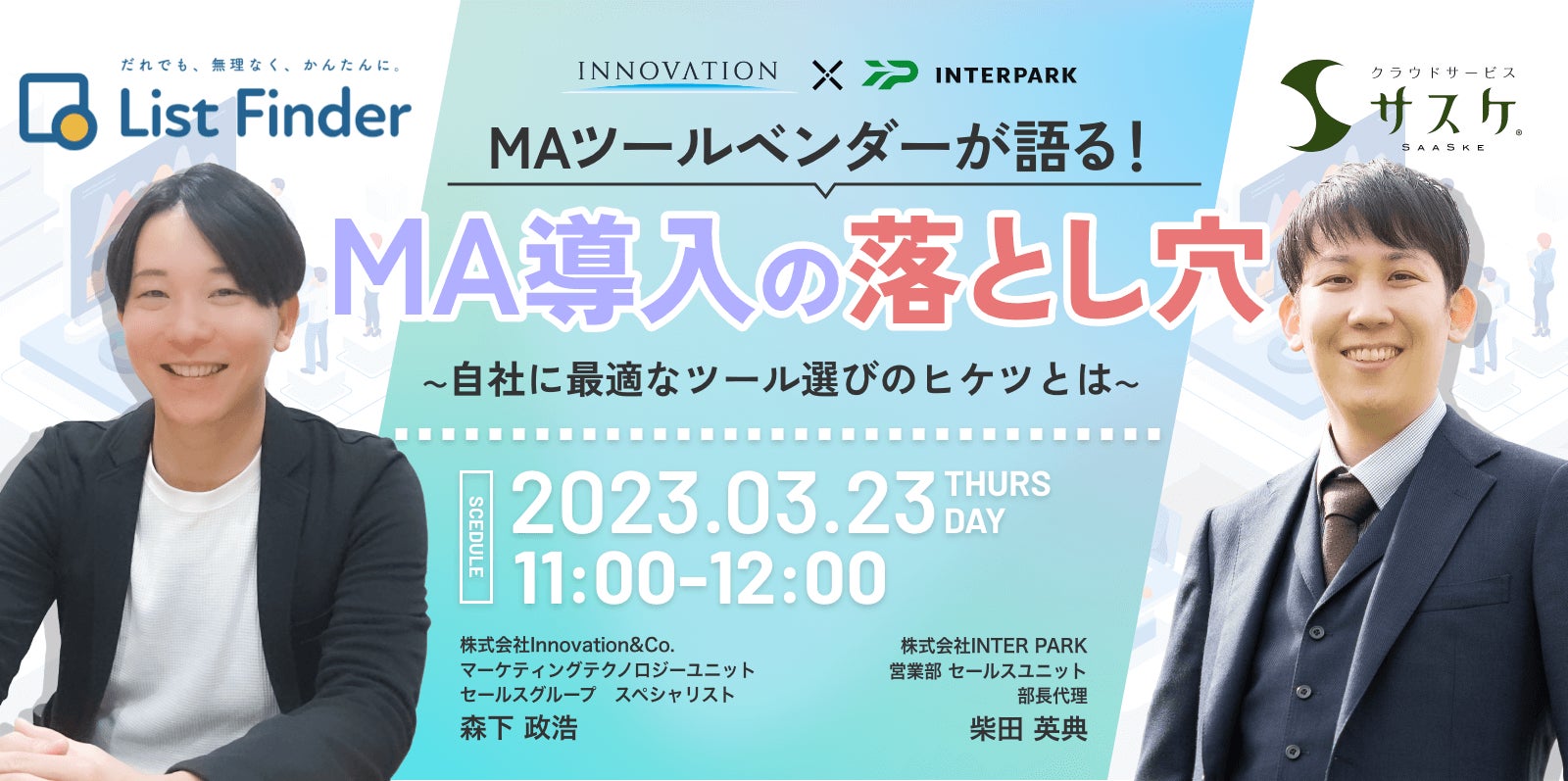 MAツールの「List Finder」を展開する株式会社Innovation&Co.と「クラウドサービスサスケ」を展開する株式会社インターパークが「自社に最適なツール選びのヒケツ」について、ご案内するセミナーになります。