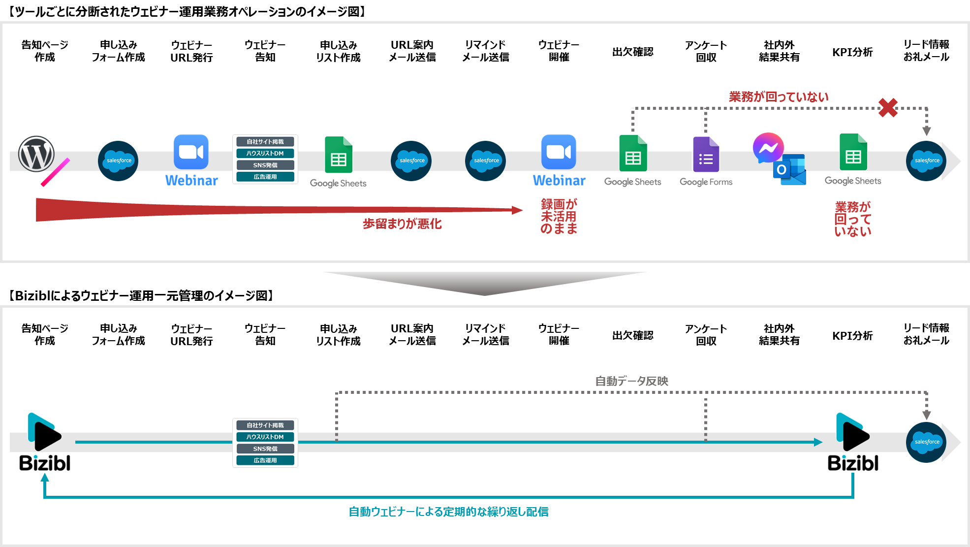 ウェビナーをマーケティング手法として活用するにあたって、リード顧客である参加者の出席状況、滞在時間などのログやアンケート回答内容は、その後のナーチャリングにおいて非常に重要なデータです。しかしながら現在多くの企業は、集客、ウェビナー配信、アンケートフォームなど、それぞれ異なるツールを利用しており、ツールごとにデータが分断されている状況です。データの移管は人為的に行われているケースが多く、CSVデータのフォーマットの差異などといった煩雑さが新たな負担として生じています。当社では、そうした運用業務の負荷も含め、ウェビナー開催におけるオペレーションが分断された状態を解決するべく、告知からデータ管理までワンストップで実現する「Bizibl」を提供しております。