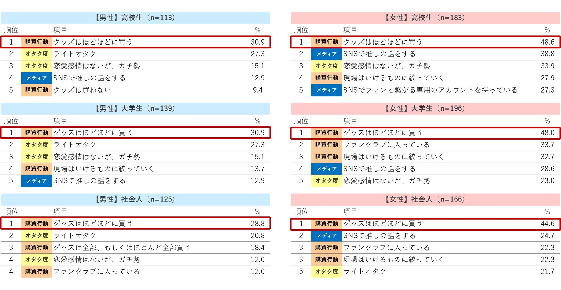 どの年齢層においても「グッズはほどほどに買う」が1位となり、自分のできる範囲内での推し活を楽しむ人が多い傾向にあります。男性は「ライトオタク」が上位ですが、女性は「ガチ勢」が上位に来る傾向にあり、オタ活は男性に比べ女性の方が活発です。若い年齢層の方がメディアに関する項目が上位にあり、SNSでのオタ活は若い世代が中心となっています。