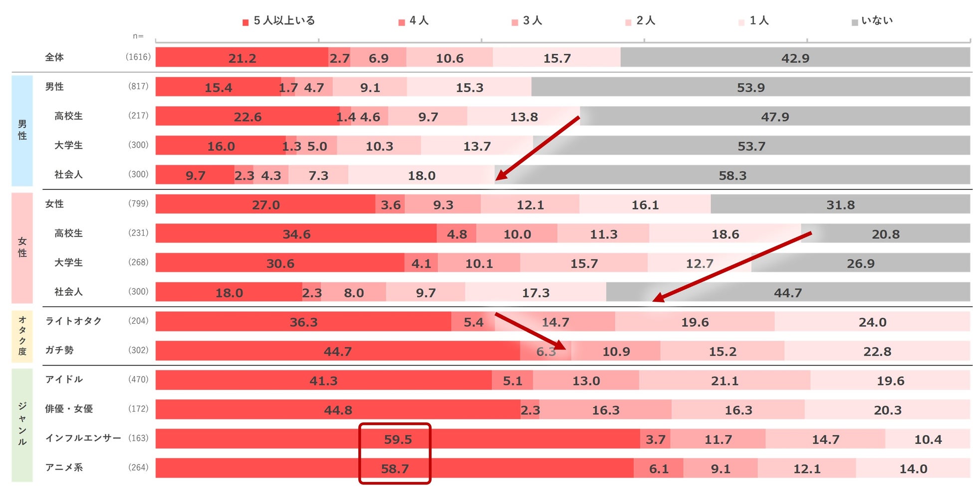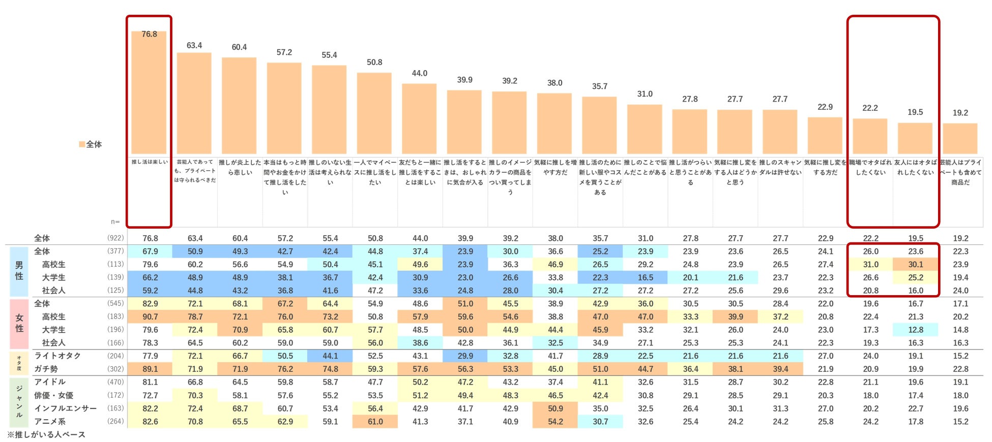 その結果、Z世代の半分以上が自分には「推し」の存在がいて、特に大学生以下の女性では約7割以上が推しの存在がいるようです。