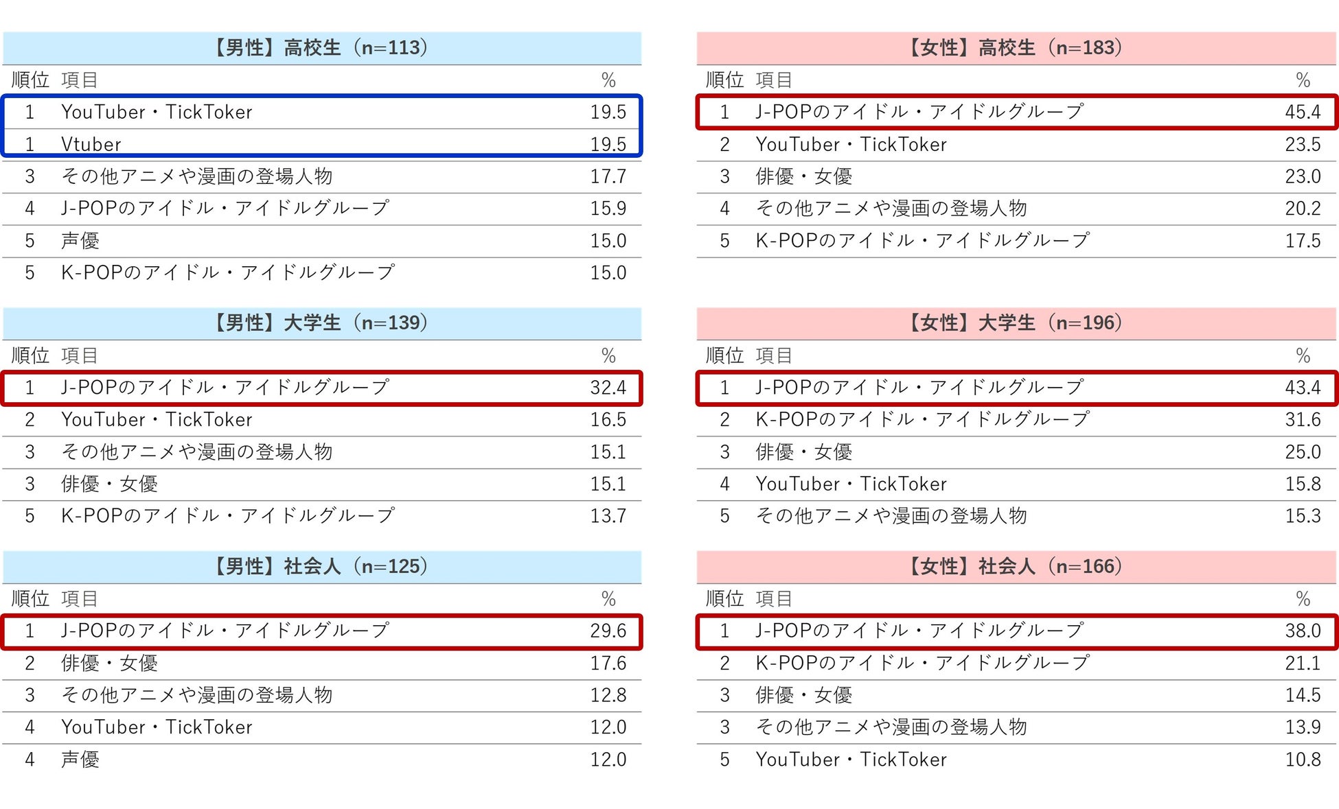 では、かれらが「推し」ているのはいったい誰なのでしょうか?性別/属性別の傾向を確認すべくTOP5までをランキング表にしてみました。