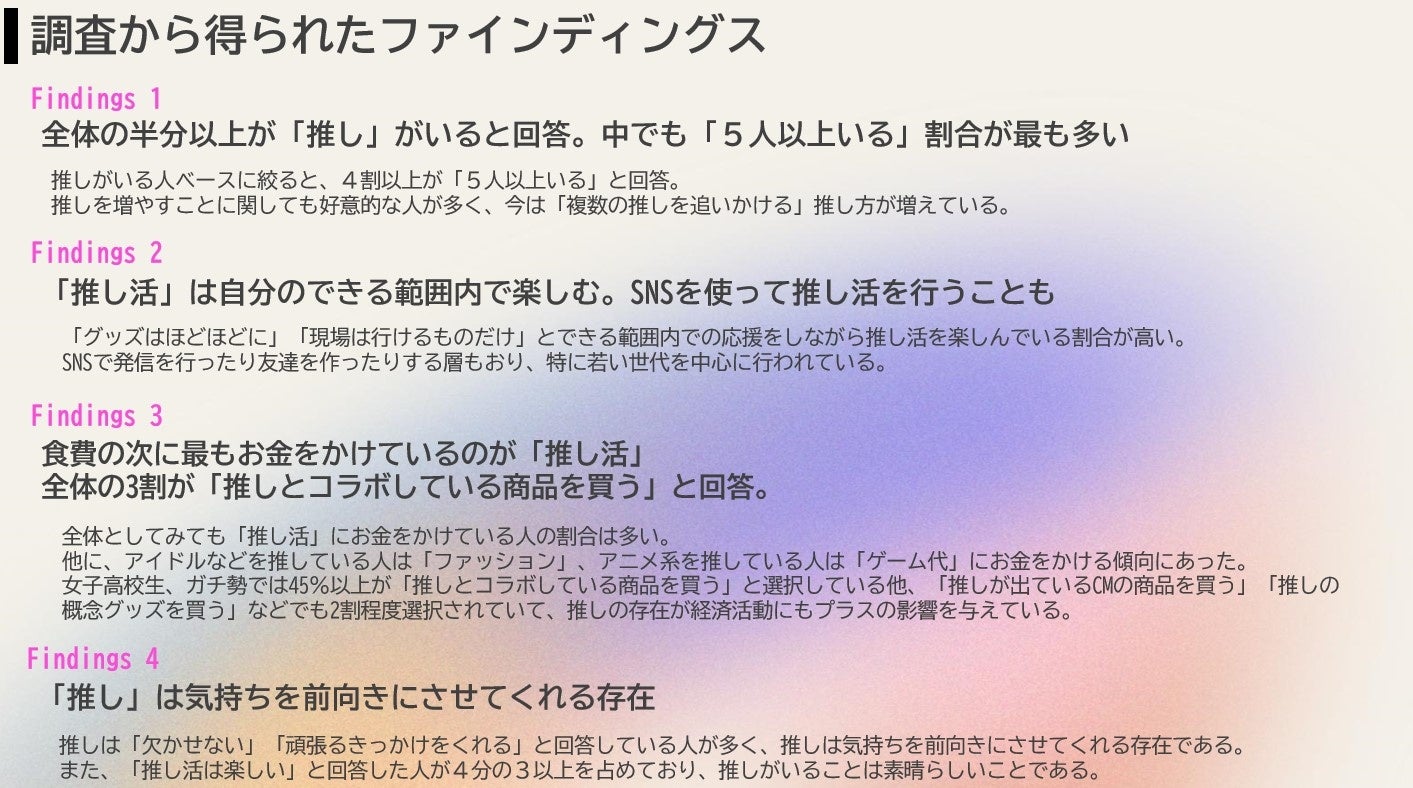 以上、「Z世代のイマ ~推しがいれば彩る生活~」として結果のレポートをお伝えしました。