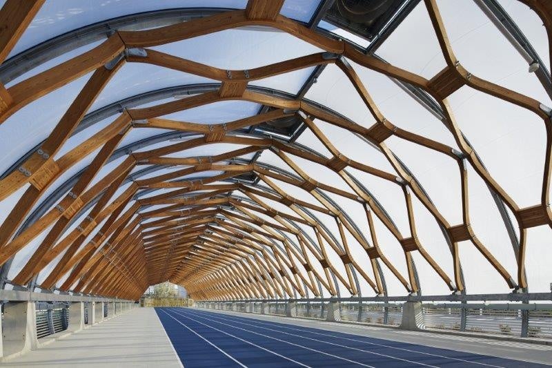 「新豊洲Brilliaランニングスタジアム」は、誰もがスポーツやアートを楽しめるコミュニティ空間として、またパラリンピアンを目指す障がい者スポーツのトレーニング施設として、2016年12月10日にオープンしました。新素材として注目されていた高機能フッ素樹脂膜材「ETFEフィルム」を日本ではじめて大規模に採用するとともに、ユニット化した国産カラマツ集成材でアーチ形状を構成しています。期限付き建築物での木造の普及促進につながる建築システムを実現し、2017年のグッドデザイン賞(公益財団法人日本デザイン振興会)を受賞しました。また、解体(移築)にも配慮されたジョイントディテールの美しい仕上がりや、EFTEフィルム膜が一般化に向け告示化された点などが評価され、2019年の「建築学会賞(作品)」(一般社団法人日本建築学会)を受賞しました。