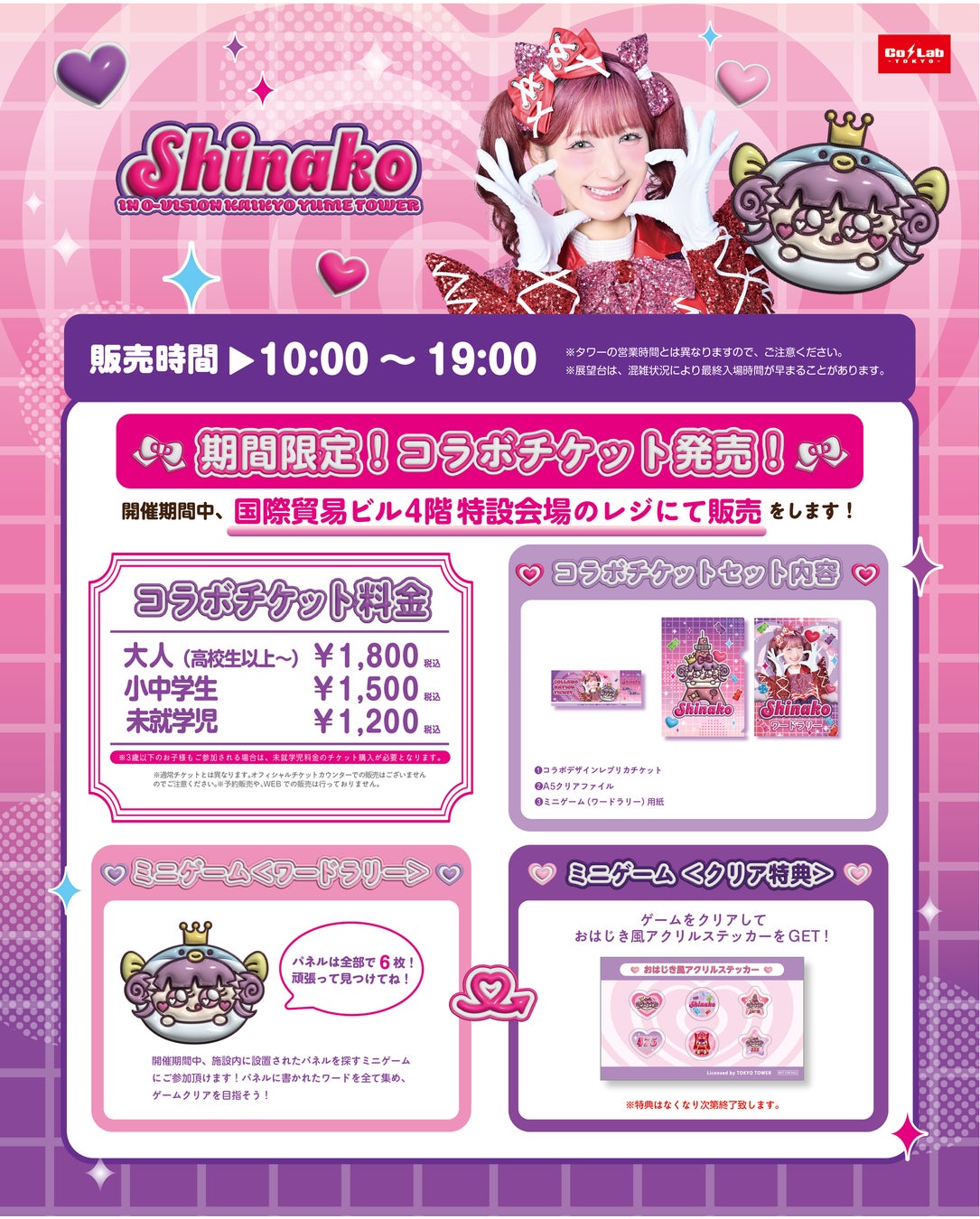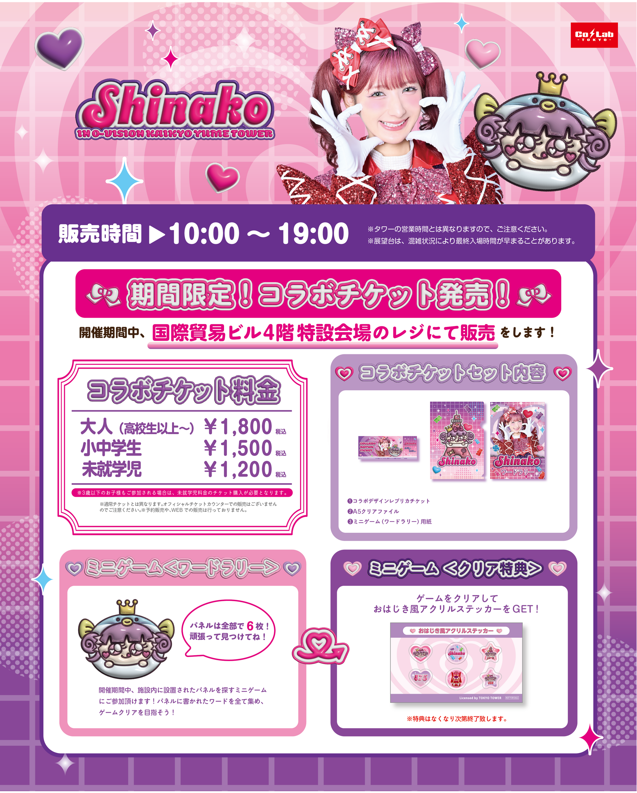 今回開催される『しなこ × オーヴィジョン海峡ゆめタワー』では、館内に隠れたしなこちゃんのパネルを探すワードラリーが楽しめる「コラボチケットセット」を販売致します。本イベント限定のクリアファイルやコラボデザインのレプリカチケットが付いています。ワードを全て集めて特設会場へ持っていくと【おはじき風アクリルステッカー】をプレゼントいたします。