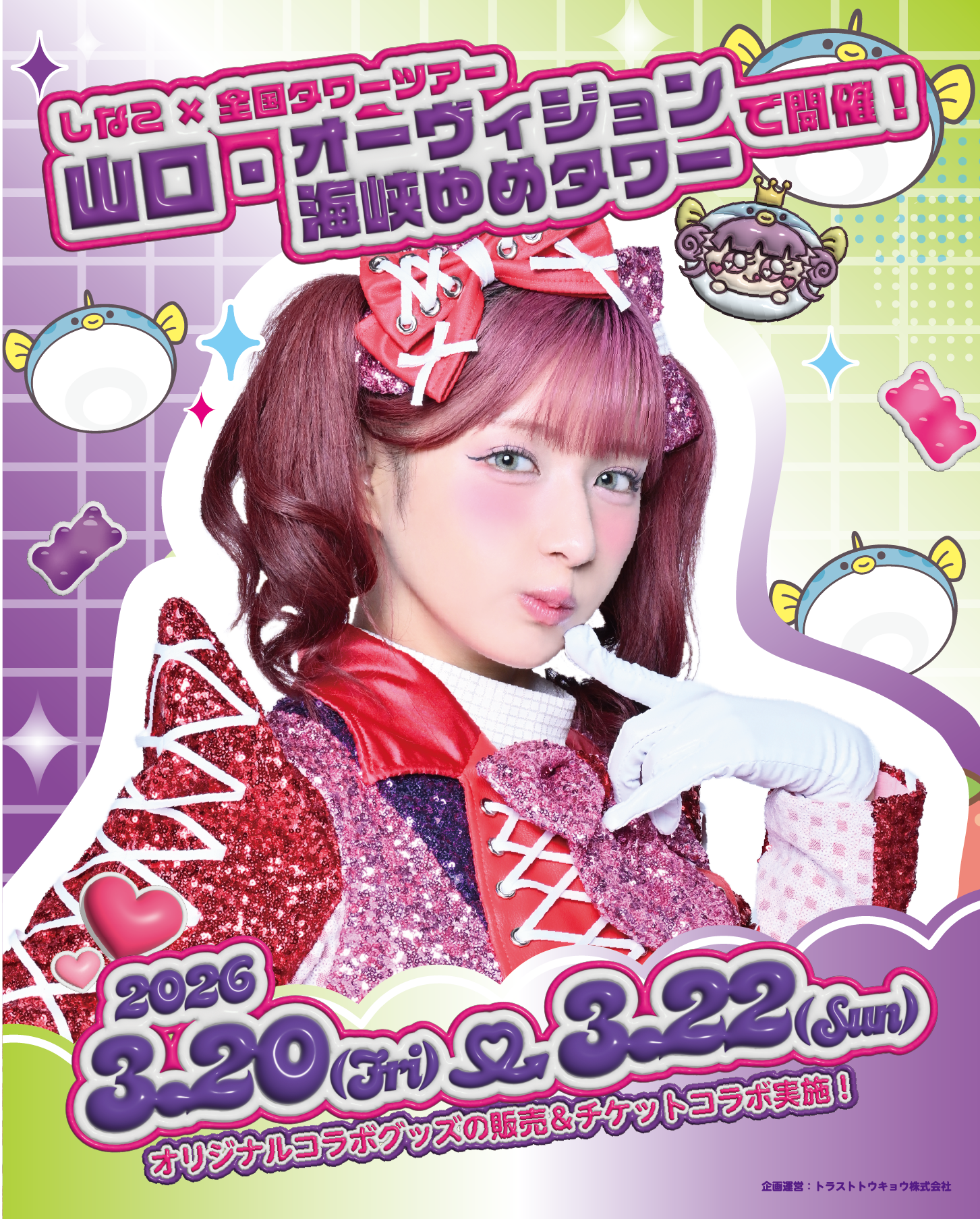 トラストトウキョウ株式会社(本社:東京都渋谷区)が「オーヴィジョン海峡ゆめタワー」(所在地:山口県下関市)にて2026年3月20日〜3月22日まで「しなこ」と「オーヴィジョン海峡ゆめタワー」のコラボイベント『しなこ × オーヴィジョン海峡ゆめタワー』を開催致します。
