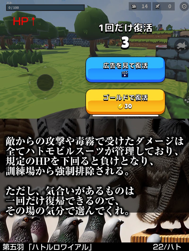 さらにゲームに登場するハトは全員とても頑丈なハトモビルスーツを着ている為、試合で敗北したとしても元気ということもマンガ内でお伝えしており多くの方に安心していただけるのではないかと思います。