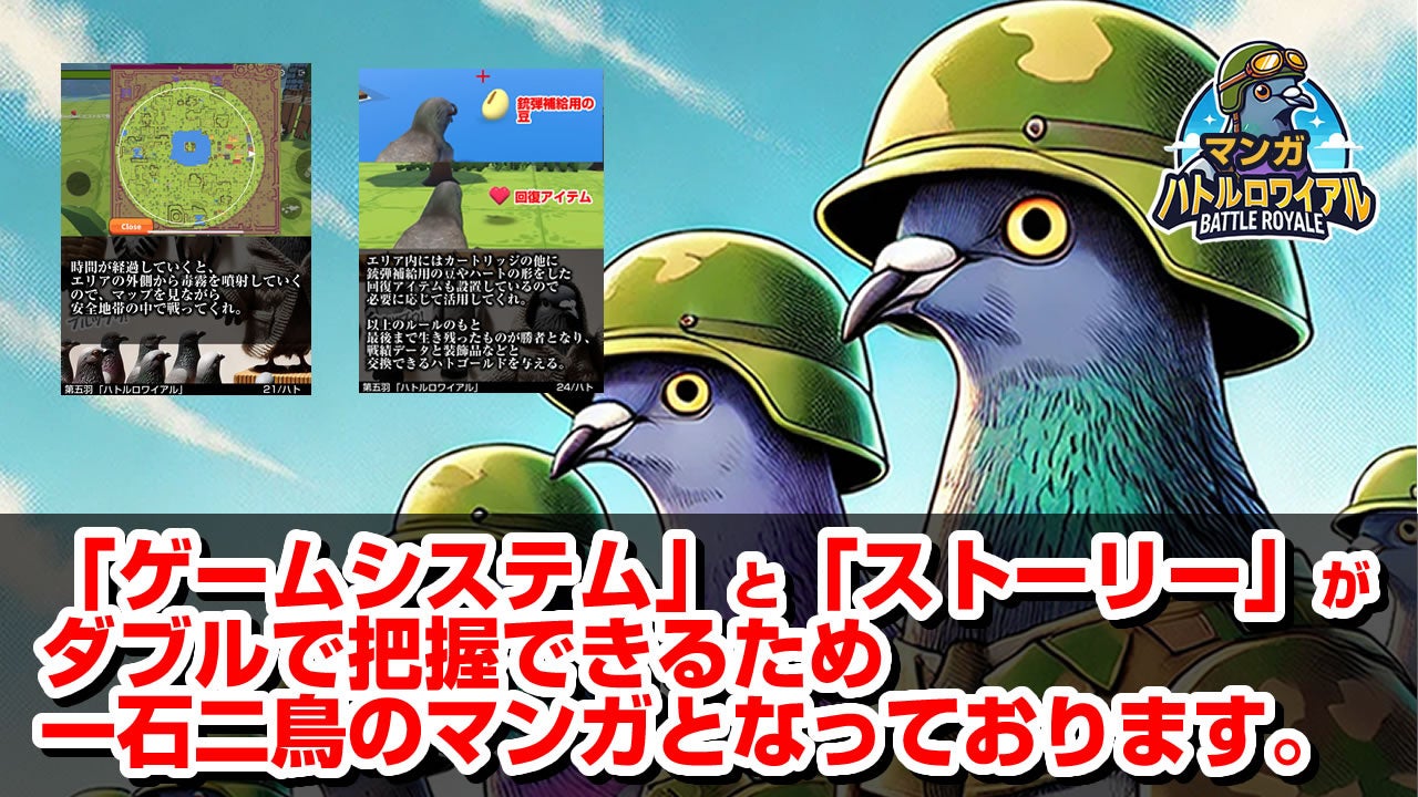ゲーム内では20羽のハトが豆で撃ち合い、勝ち残ることを目的に戦うのですが、一体なぜハト同士で豆で撃ち合う必要があるのかという素朴な疑問をマンガを読むことで理解することが出来ます。