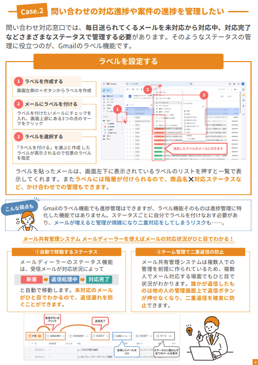 Gmailのラベル機能やOutlookのカテゴリ機能によって進捗管理は可能ですが、ステータスごとに自分でラベル/タグを付けなおす必要があるため、メールが増えると管理が煩雑になり二重対応をしてしまうリスクもあります。