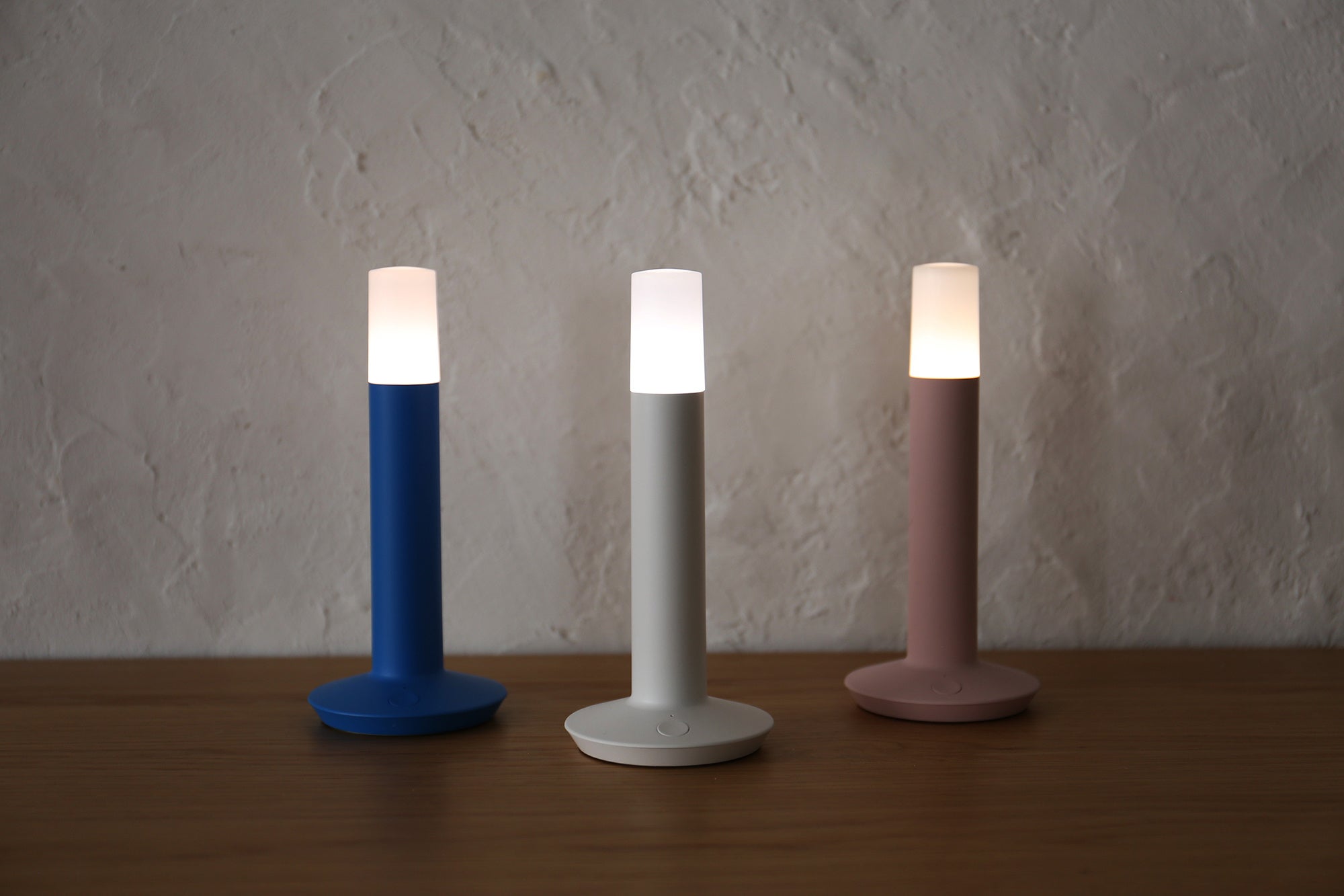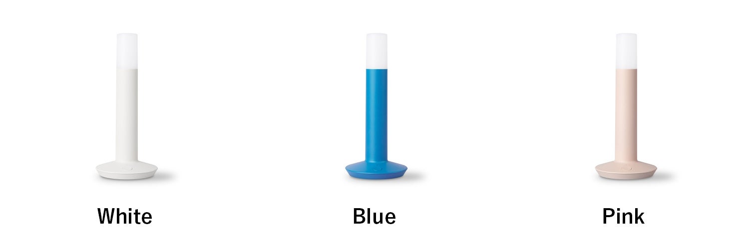 カラーはホワイト、ブルー、ピンクの3色をご用意、シンプルで洗練されたデザインは、どんな空間にも溶け込み、日常生活の中で輝く瞬間をもたらすオブジェとして私たちを照らしてくれます。また、リビング・ベッドルームなど室内はもちろんのこと、アウトドア・災害時など幅広い用途にご使用いただけます。