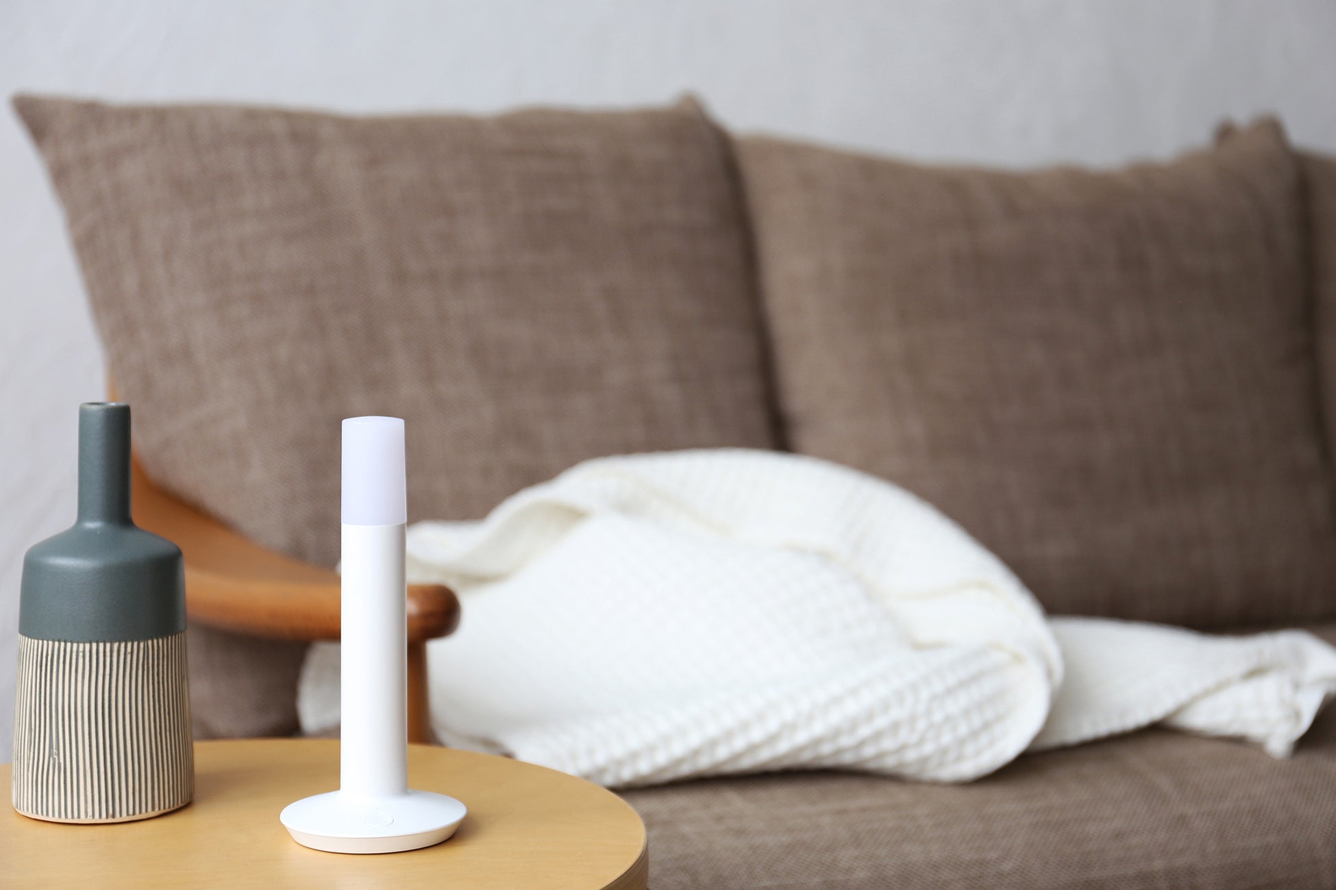 この度発売する商品『Lighthouse』は、本体サイズ 直径75 x 高さ175 mmと手のひらサイズでありながら、最長6.5日の連続点灯が可能。電球色と蛍光灯色の2つの光源を実装し、それぞれ3段階調光が可能。そして、30 / 60 / 90分のタイマー付きで、ワイヤレスチャージ対応と機能も充実しています。