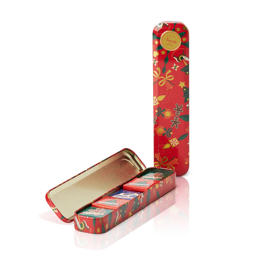 鮮やかなレッドベースにクリスマスツリーが描かれたミニブック缶の2025年クリスマス限定バージョン。イタリアを代表するチョコレート「クレミノ」12個をアソート。