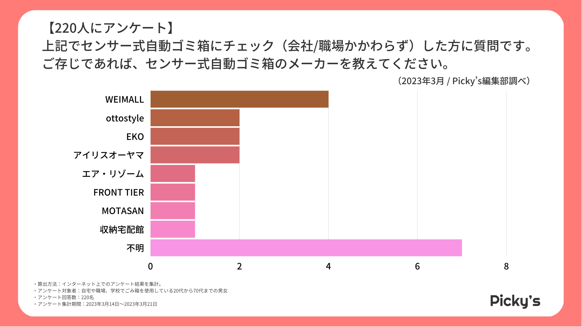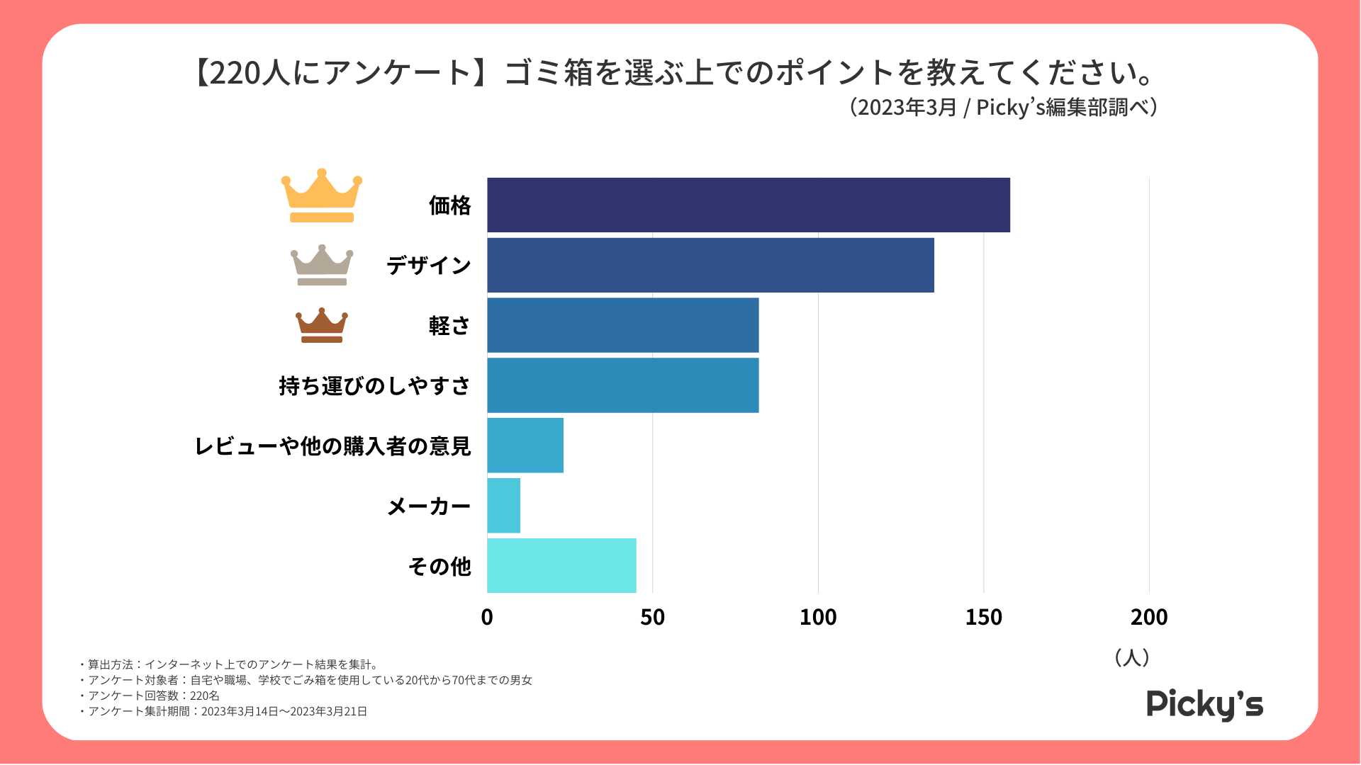 「Picky’s」は、インターネットショッピングにおいて、購入前に試せない・選ぶべきものがわからないという課題の解決を目標に、あらゆる商品のおすすめランキングや検証レビューを紹介するサイトです。このたびPicky’s(https://rentry.jp/note/)では、2023年5月3日ごみの日に先駆けて、ごみ箱についてインターネット上でアンケート調査を行いましたので発表いたします。