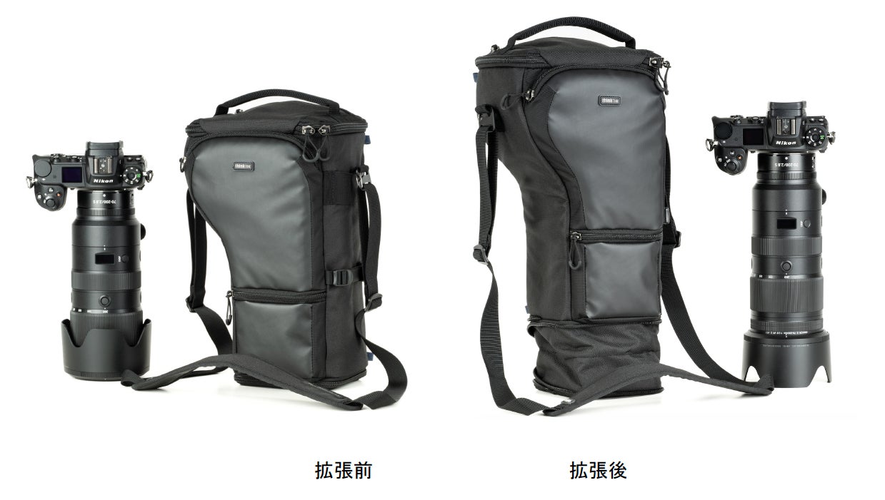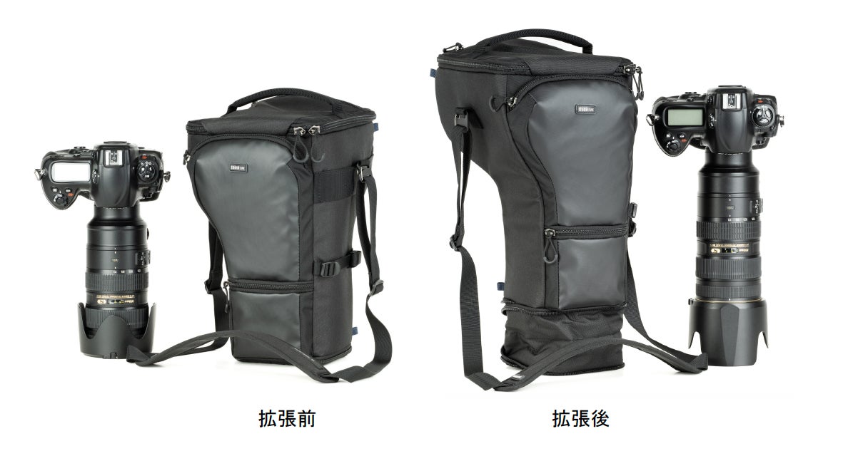 グリップ付一眼レフに70-200mm F2.8を装着し、フードを逆付けした状態で収納可能。底を拡張できます。底部拡張時はグリップ付一眼レフに70-200mm F2.8を装着し、フードを順付けした状態で収納可能。