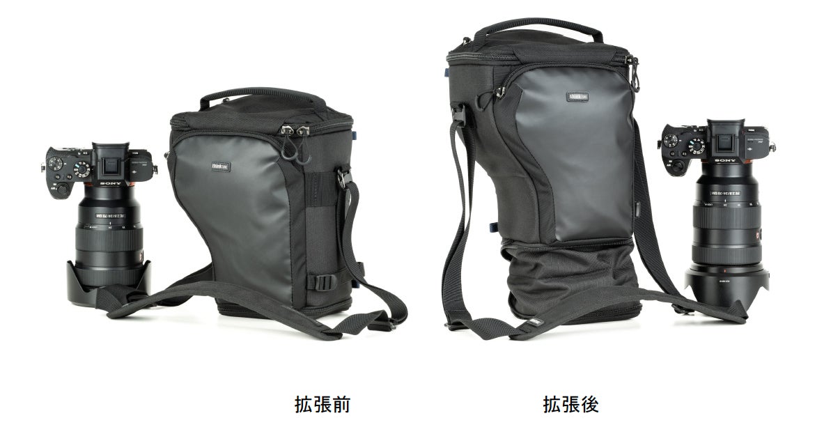 ミラーレスカメラに24-70mm F2.8を装着し、フードを逆付けした状態で収納可能。底を拡張できます。拡張時はミラーレスカメラに70-200mm F2.8を装着し、フードを逆付けした状態で収納可能。