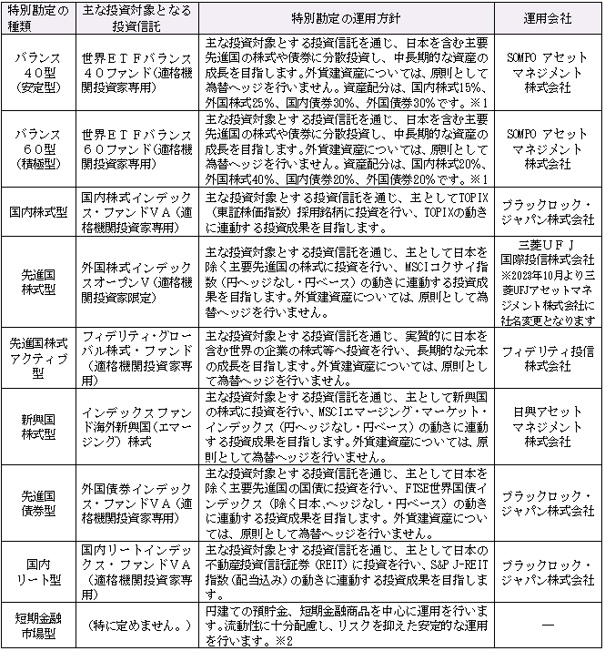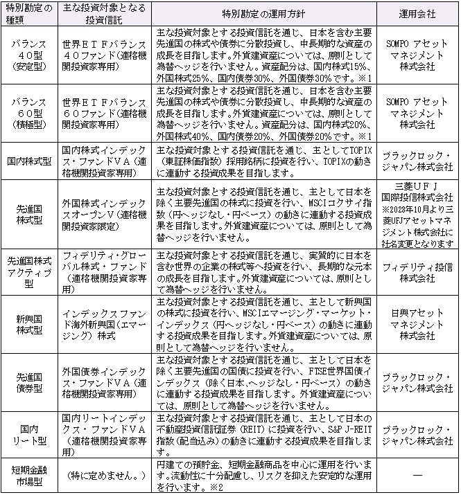 9種類のファンドを自由に組み合わせることが可能です。選択できる特別勘定は下表のとおりです。