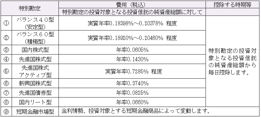 ・①、②はバランス型投資信託であり、上表の信託報酬率は、基準配分比率に基づき算出していますが、実際の組入れ比率は運用状況に応じて変動するため、運用関係費用も変動します。加えて、組入れファンドの一部は市場金利に応じて信託報酬率が変動します。