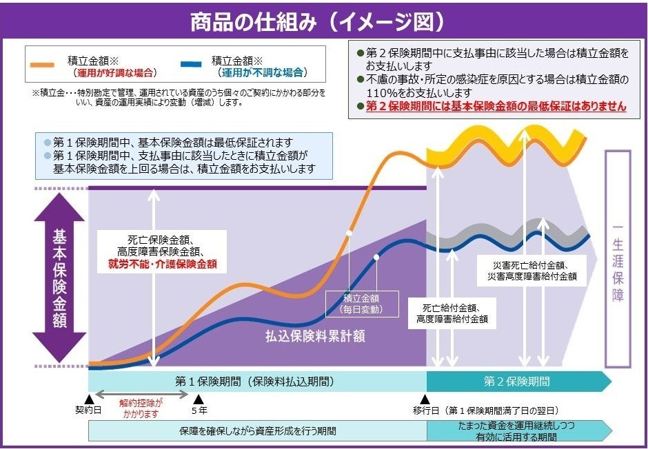 本商品は、万が一の死亡保障に加え、現役世代の資産形成を行う上で大きなリスクとなる就労不能や介護などの「働けない」状態を手厚く保障します。さらにお客さまの健康状態に応じて資産形成の効果を高めることができる「健康積立金」の仕組み、保険料払込期間終了後も特別勘定での運用を継続できる第2保険期間など、業界初となる仕組みを導入しました。