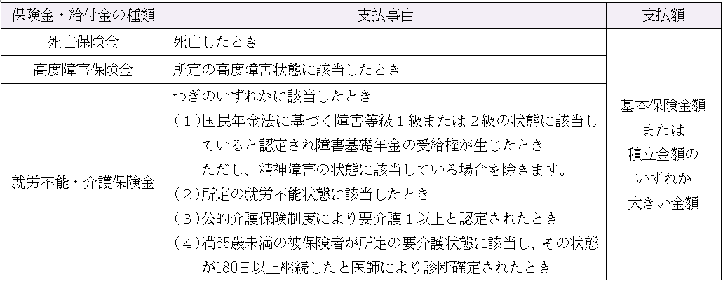 ‐第1保険期間(保険料払込期間)中は、死亡・高度障害に加え、就労不能状態・要介護状態を保障