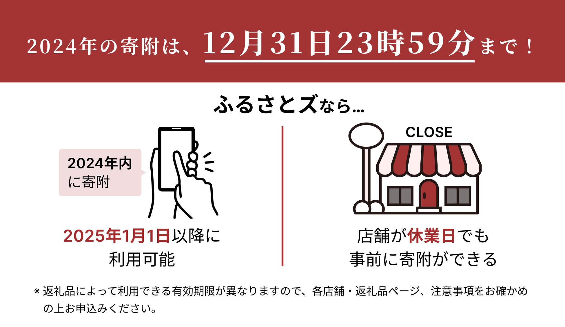 店舗型ふるさと納税(R)『ふるさとズ』なら、年内のご寄附で即時発行される「ご利用券」や「クーポン」は、来年でもご利用いただけます。今年中に現地へ行く予定がなくても、お店が年末年始休業中でも、ご寄附をすることができ、今からでもマチを応援することが可能です。