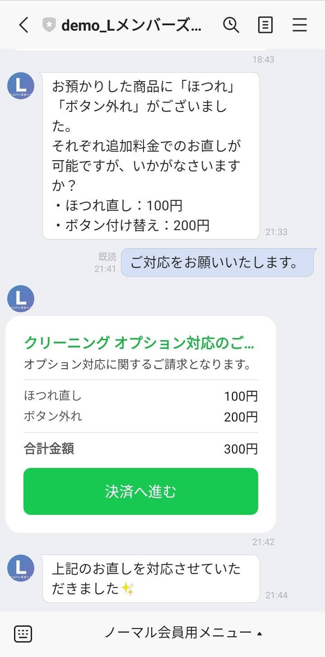 クリーニング店では、預かった衣服に「ほつれ」「ボタン外れ」などが見つかることが多々あります。クイック請求機能を活用することで、衣服を受け取った時点では気づけなかった内容についてオプション対応を行うことができます。