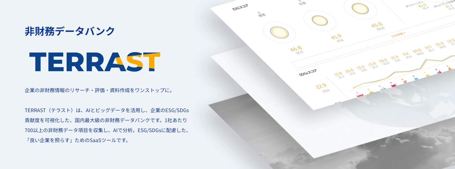当社は、AIとビッグデータを活用して「気候変動」「人的資本」「ダイバーシティ」など、様々なESG/SDGsデータを網羅する非財務データプラットフォーム「TERRAST」を開発・提供しています。