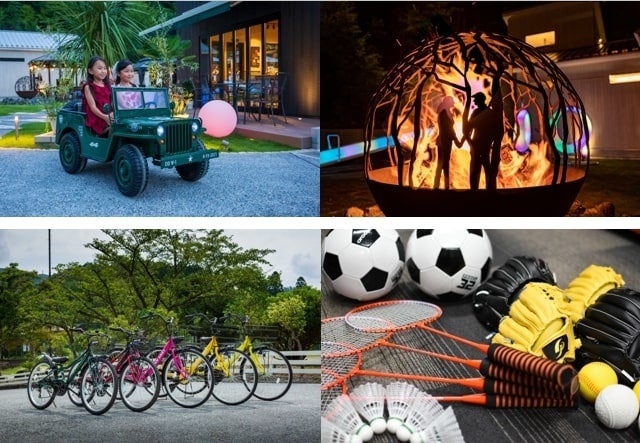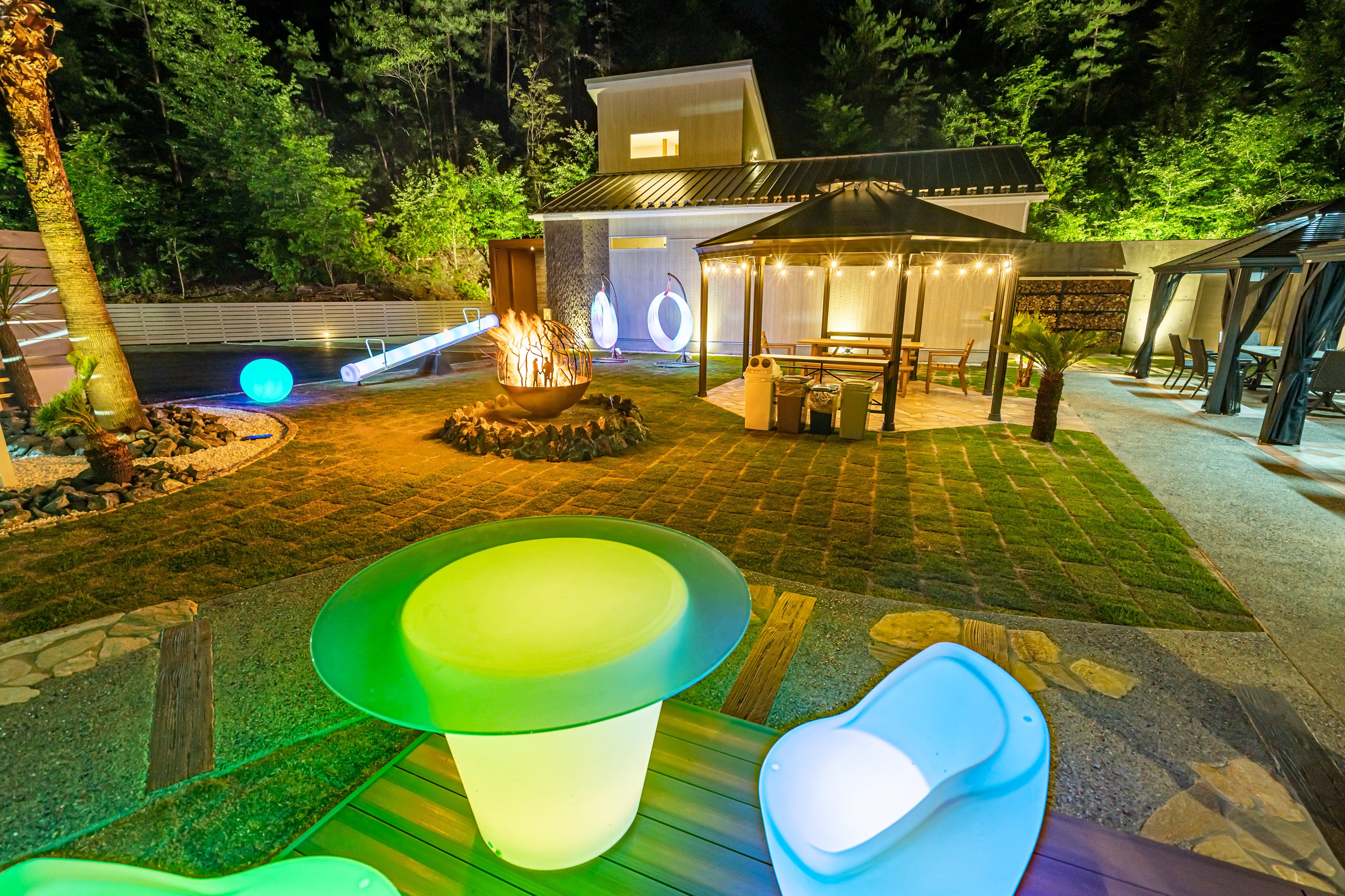 自然豊かな敷地内には、「愛の聖地」「LOVE Step」などのフォトスポットや、揺らめく炎を幻想的に彩るファイヤーピット、光るインテリアや煌めくイルミネーションや併設されたカフェ・バーなど、遊び心の溢れる別世界をご満喫頂けます。また管理棟内のショップではグランピングをさらにアクティブに楽しむためのアイテムのレンタルも多種ご用意しております。