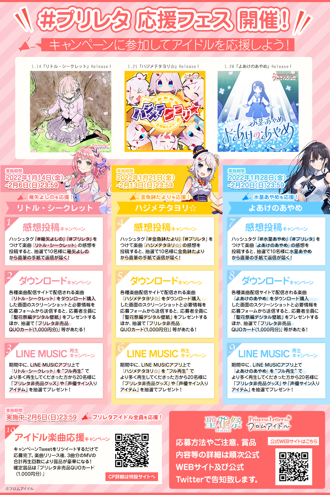 各種楽曲配信サイトで配信される楽曲『リトル・シークレット』をダウンロード購入した画面のスクリーンショットを、特設フォームから必要情報を入力して送信すると、応募者全員に「聖花祭編デジタル壁紙」をプレゼントするほか、抽選で「プリレタ非売品QUOカード(1,000円分)」等が当たる。