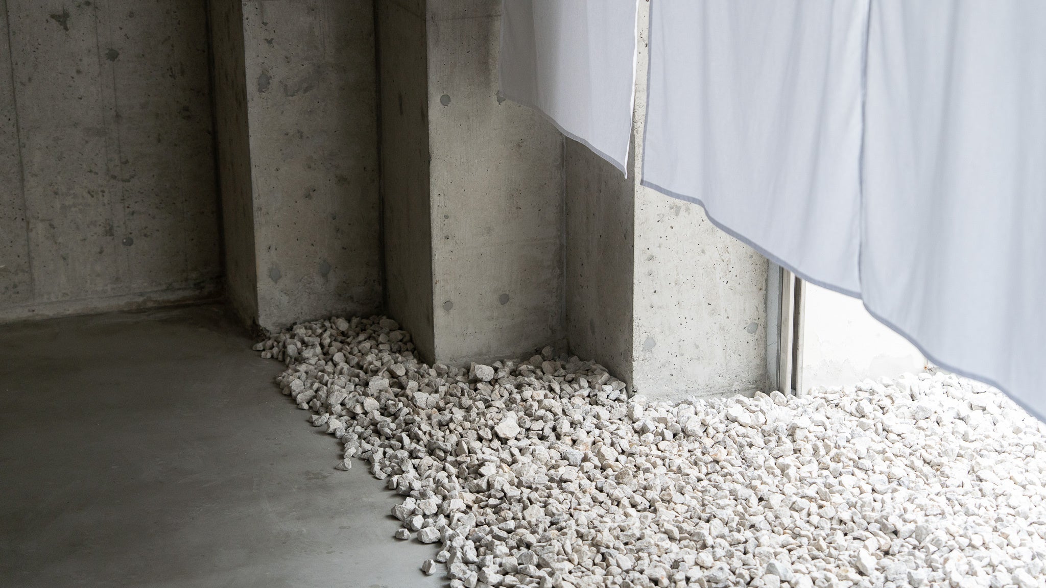 道路に面したガラスの奥には、全長8mの「のれん」を設置。奇数が縁起が良いとされる日本の文化的背景を踏まえ、9巾で仕立てた「のれん」。床に敷き詰められた砂利とともに、内と外の境界をやわらかく切り替えます。