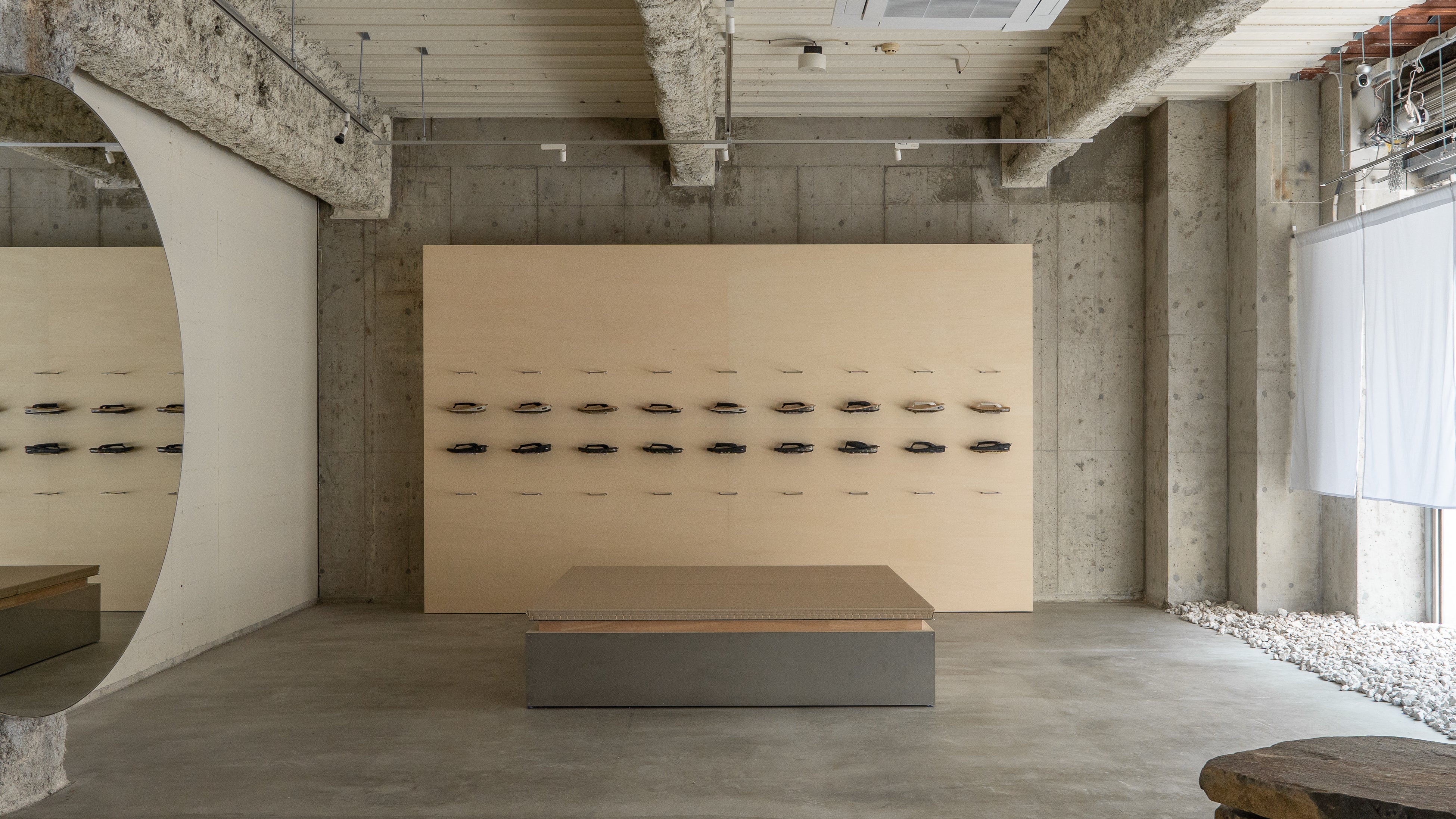 壁面には、スニーカーショップを想起させるシューズウォールを展開。雪駄という伝統的な履物を、現代の文脈で陳列しています。