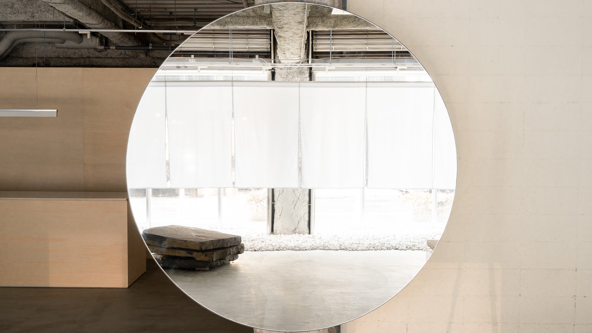 店内中央には、最大の特徴でもある、直径2.1mの円形ミラーを配置。流れゆく風景を切り取り、室内の構図として成立させる「借景」の思想を、空間へと落とし込んでいます。