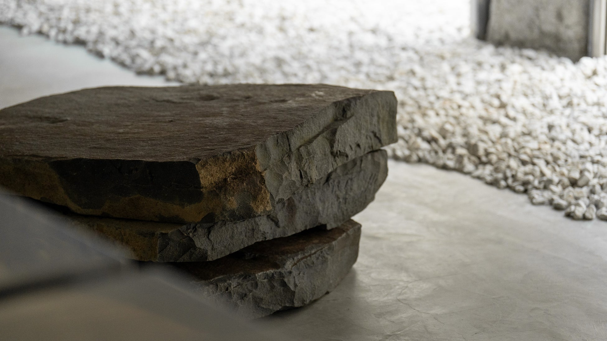 さらに、1.8m角の畳什器(畳2畳分)や、3枚の石を重ねた石のオブジェを配置することで、日本の空間構成の要素を点在させています。