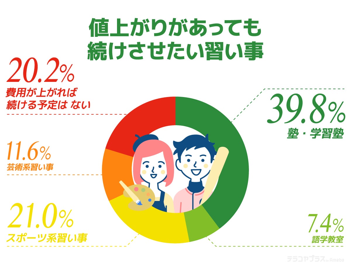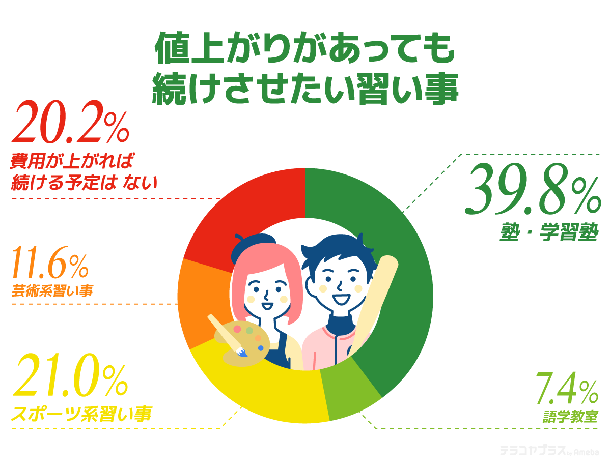 保護者の半数以上が値上がりを感じていると答えた「習い事費」では、「塾・学習塾」の値上がりを実感している保護者が多い一方で、値上がりが続いても続けさせたい習い事の1位も「塾・学習塾」でした。