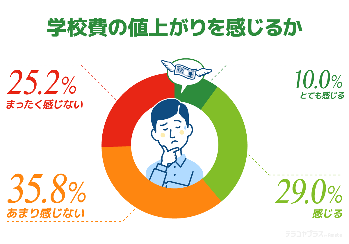 「学校費の値上がりを感じるか」尋ねたところ、もっとも多かったのは「あまり感じない」で35.8%、また「まったく感じない」も25.2%いることから、「学校費」の値上がりを感じている保護者はあまり多くないようです。