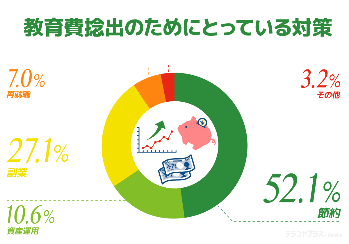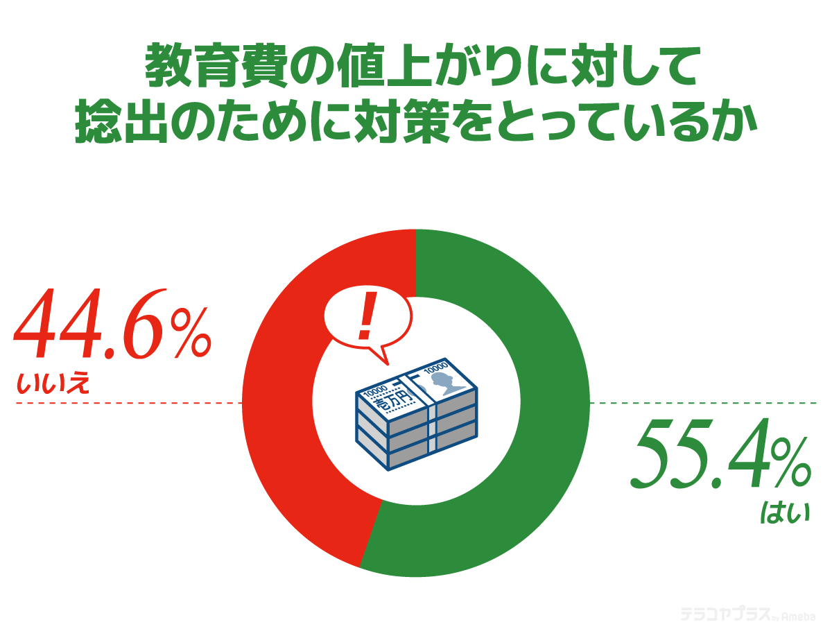 そのうえで、今後も上がり続けることが予想される「教育費」を捻出するために対策をとっているか尋ねたところ、約5割超(55.4%)が「はい」と回答。具体的な対策では「節約」(52.1%)がもっとも多く、次いで「副業」(27.1%)でした。