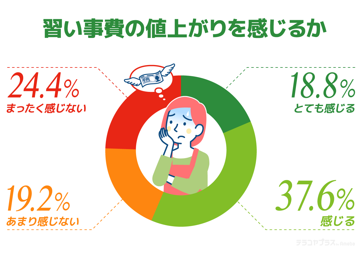 続いて学校外での「習い事費の値上がりを感じるか」尋ねたところ、「とても感じる」が18.8%、「感じる」が37.6%、合計すると半数以上(合計56.4%) の保護者が値上がりを実感していました。