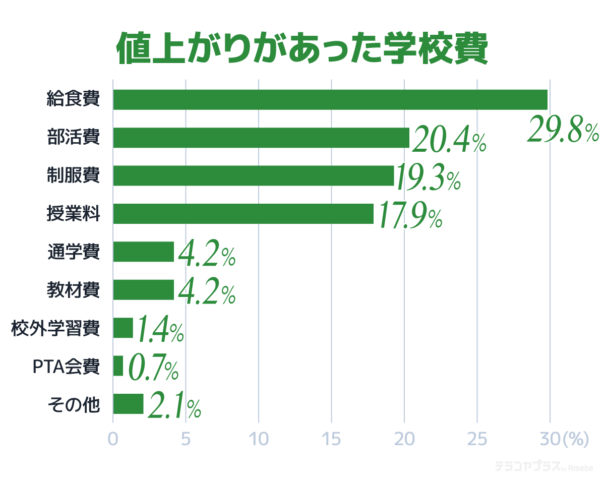 学校費の値上がりを実感している保護者に、どの項目で値上がりがあったか尋ねたところ、もっとも多かったのは「給食費」(29.8%)、次いで「部活費」(20.4%)、制服費(19.3%)、「授業料」(17.9%)でした。